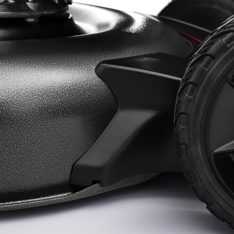 Gracias a la combinación de la carcasa metálica y los materiales poliméricos se consigue una rigidez en el tren trasero jamás conseguida. Esta rigidez, junto con el renovado sistema de transmisión, permite reducir drásticamente la fuerza a ejercer por el usuario para mover la maquina hacia atrás al sortear obstáculos y maniobrar en espacios reducidos.