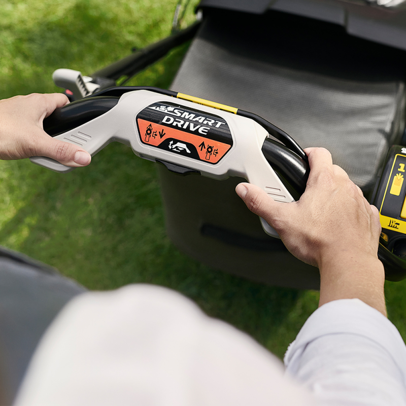 El cortacésped Honda HRN 536 VYE incorpora una versión optimizada para este modelo del Smart Drive® de Honda, estándar en la gama HRX, que permite regular la fuerza y posición de la palanca de manera progresiva y precisa, simplemente apoyando las manos en el manillar. El nuevo diseño de la palanca reduce el deslizamiento del pulgar para una mayor facilidad de uso.