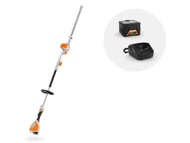 Cortasetos de altura de batería, para cortar setos altos y arbustos del jardín. Cuchillas de un filo con forma de gota, ángulo de corte ajustable escalonadamente de -45° a +90°, tubo divisible para facilitar el transporte. Longitud de transporte 115 cm, longitud total 210 cm.