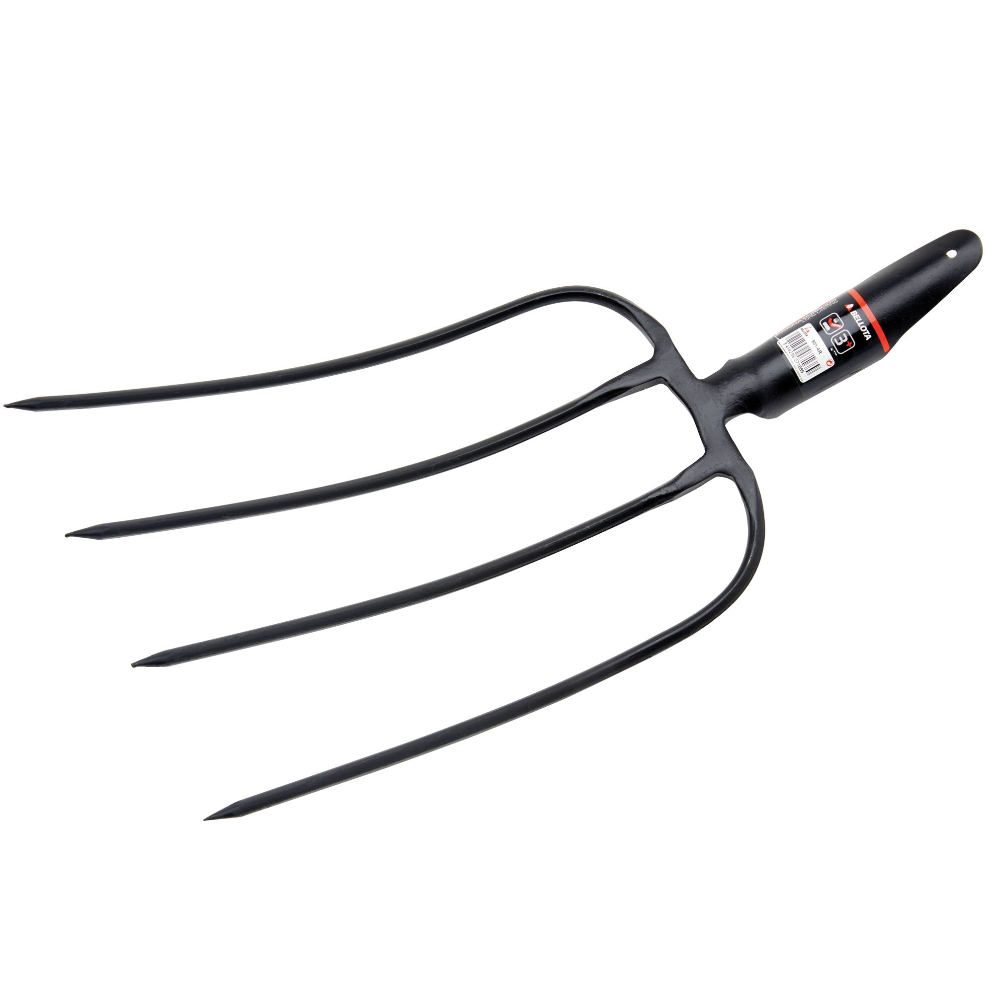 Horca de cuatro púas fabricada en acero especial y forjada en una sola pieza para recoger heno y estiércol. El cubo de enmangado está reforzado para una perfecta unión ente la cabeza y el mango. Las púas están afiladas y templadas en toda su longitud. Están pintdas con pintura especial para evitar la oxidación.
