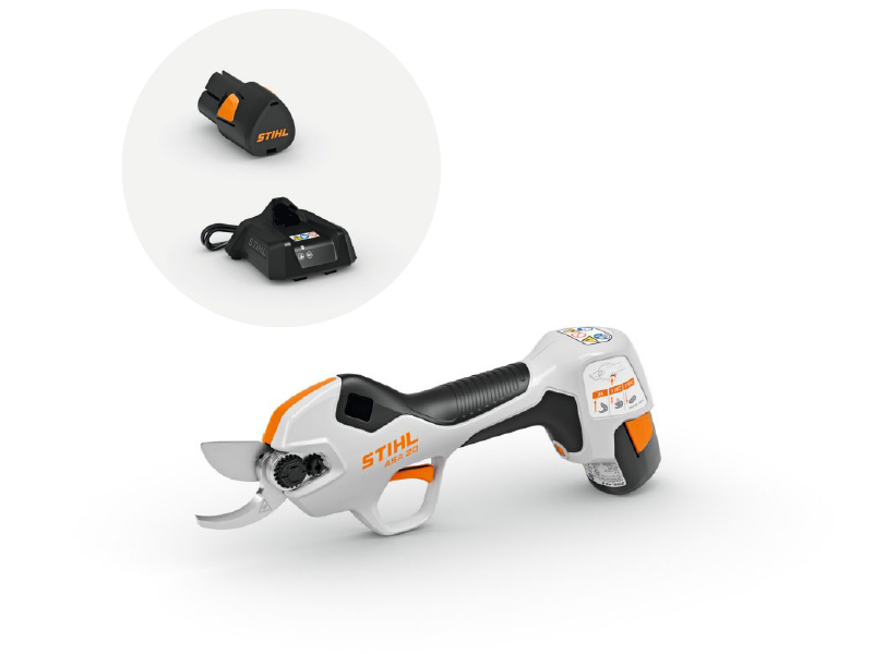 Set de tijera de poda a batería ASA 20, con batería del sistema AS y un cargador estándar AL 1.