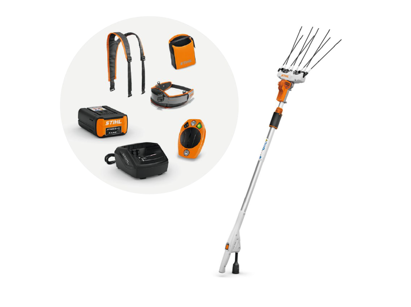 En la cosecha profesional de aceitunas, almendras, nueces y otras frutas pequeñas, vareador SPA 140 con batería y cargador y sistema C 2 A brinda un apoyo ideal. El prolongador telescópico profesional, gracias a un ajuste rápido, se puede ajustar fácilmente la longitud total deseada del SPA 140 hasta 240 cm. De esta manera, con los 8 dedos de carbono perfectamente alineados en el rastrillo, también se pueden cosechar de manera cómoda y eficiente frutas en árboles altos o ramificados, sin dañar el árbol ni las ramas. Además el vareador de batería, incluye una batería STIHL AP 500 S y un cargador estándar STIHL AL 101 .